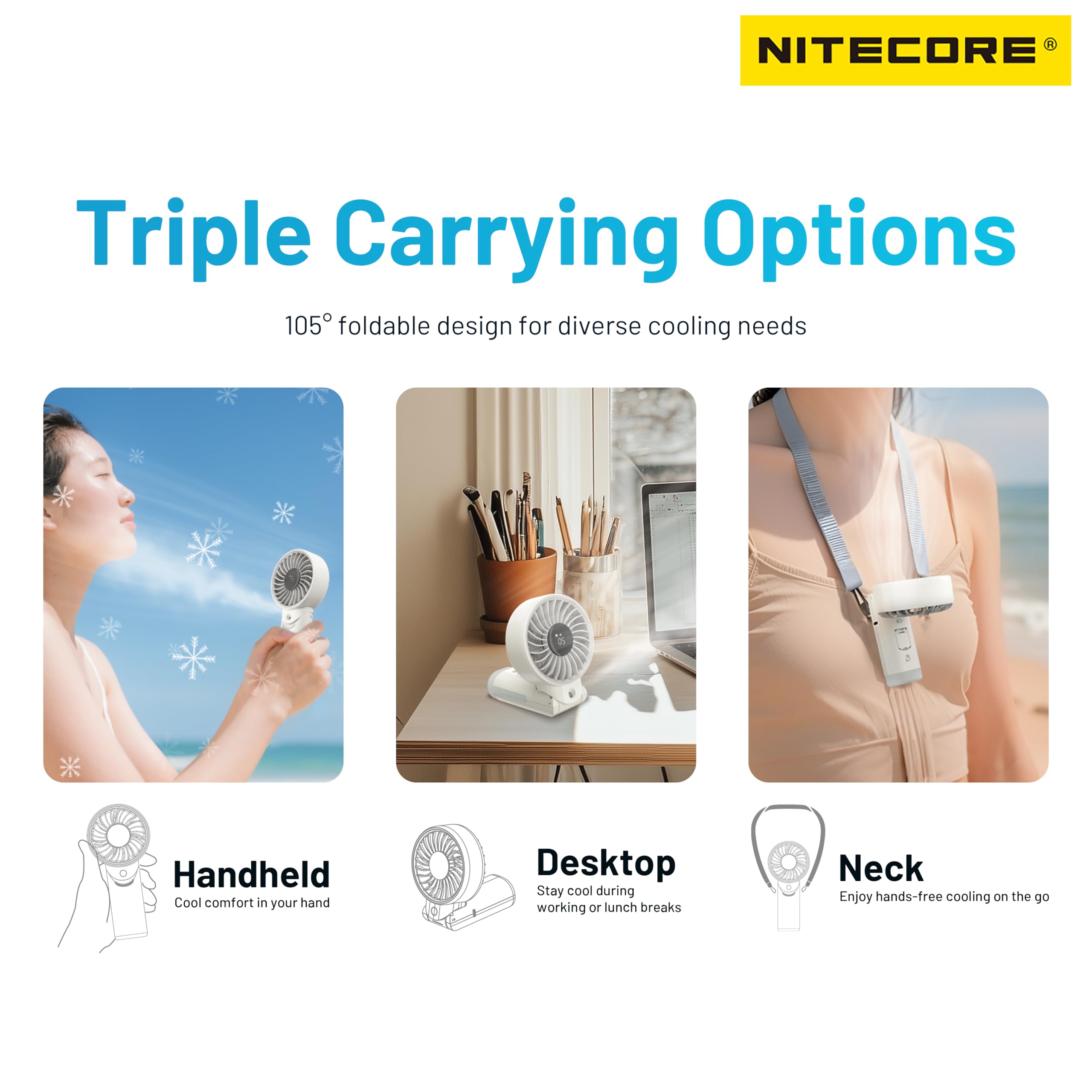 - The NITECORE izzCool 30 Foldable Air Conditioner Fan delivers a portable cooling experience with a temperature drop of up to 16°C (28.8°F) and features a foldable design for handheld, desktop and neck use. With an innovative integrated design and 10-hour max runtime, it keeps users cool anywhere, anytime.