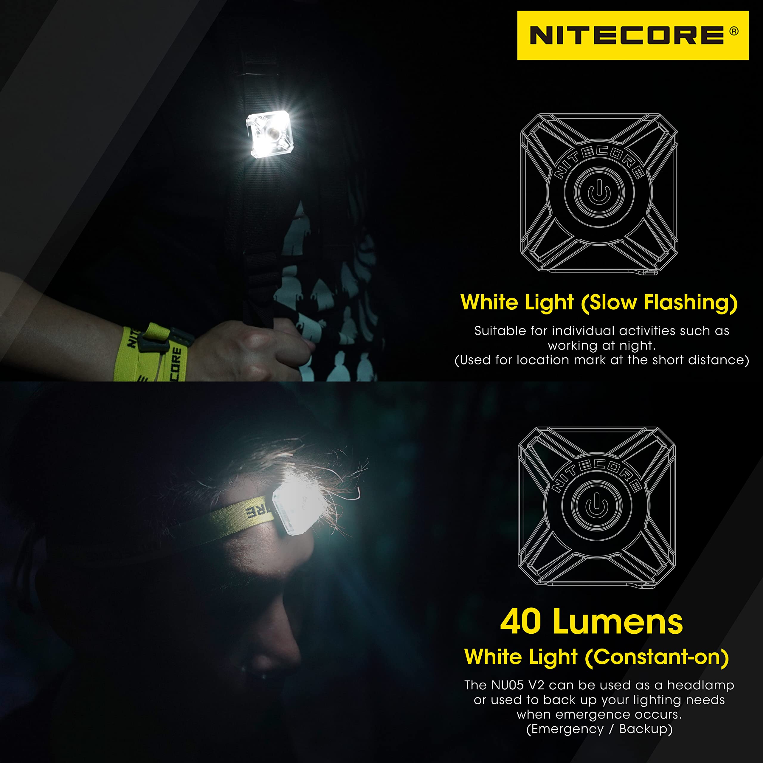- As a new member of the NU Series, the NU05 V2 Ultra Lightweight USB-C Rechargeable Headlamp Mate is launched. With a reversible plug-in of the charging cable, it is upgraded with a USB-C charging port, ideal for avoiding outdoor power shortage. Besides, multi-purpose and portable design improves safety in nighttime activities.