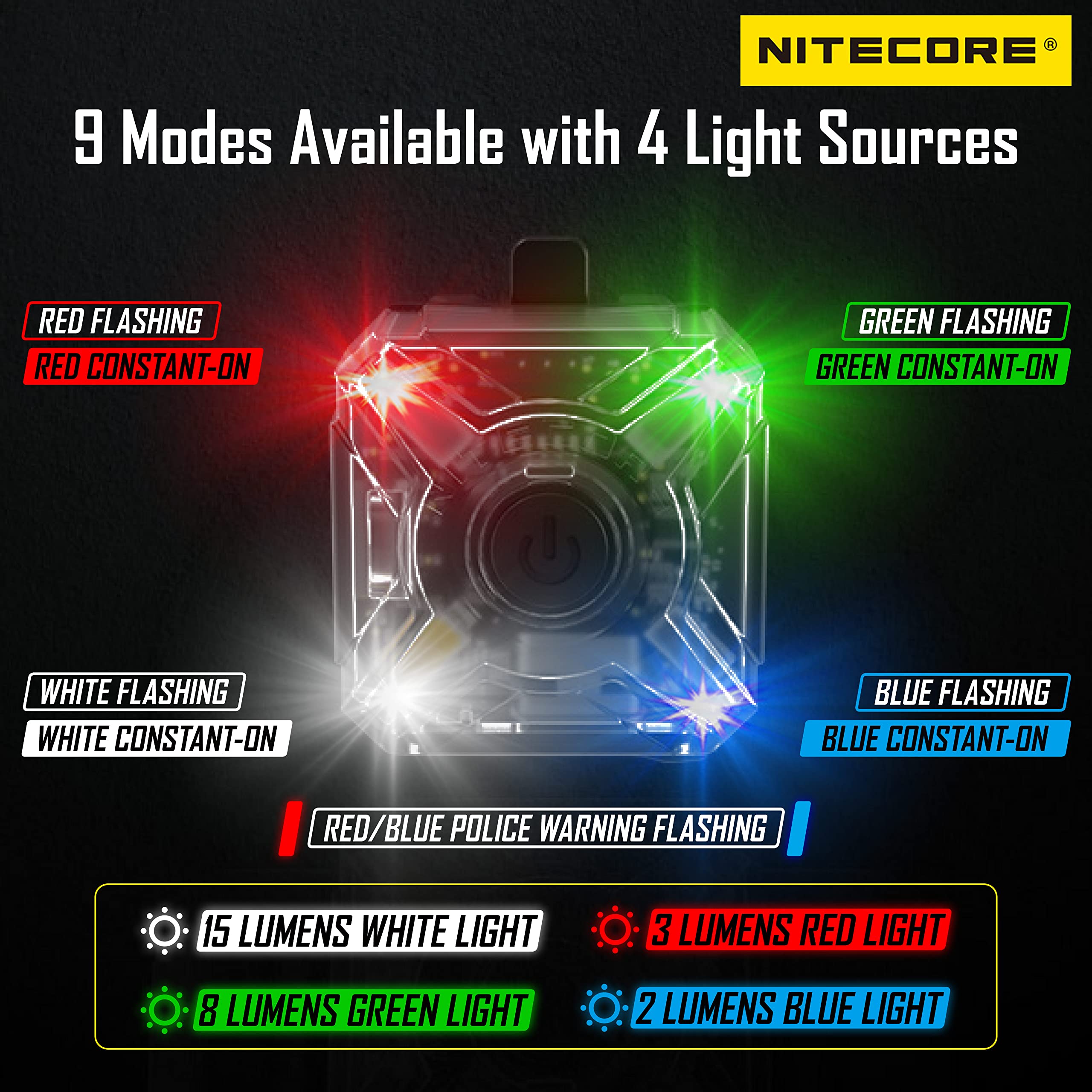 - The NITECORE NU06 LE is a USB-C Rechargeable Mini Signal Light available for 9 modes with 4 light sources including Constant-on Modes and Flashing Modes of white, blue, green and red, as well as Red/Blue Warning Flashing. The flashing colors are able to indicate different grouping or to enable quick identification on team members of specific positions.